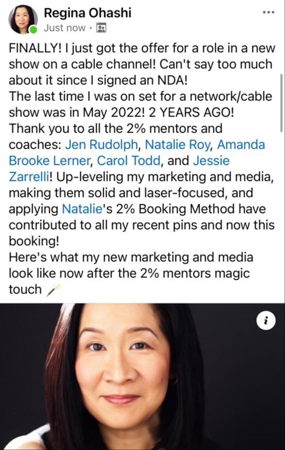 Over the course of 15+ years, I have helped over 300 actors book their 1st Co-Stars, 2nd Co-Stars, Large Co-Stars and Recurring Co-Stars  within 6 months of implementing my specific 2% methodology.Â